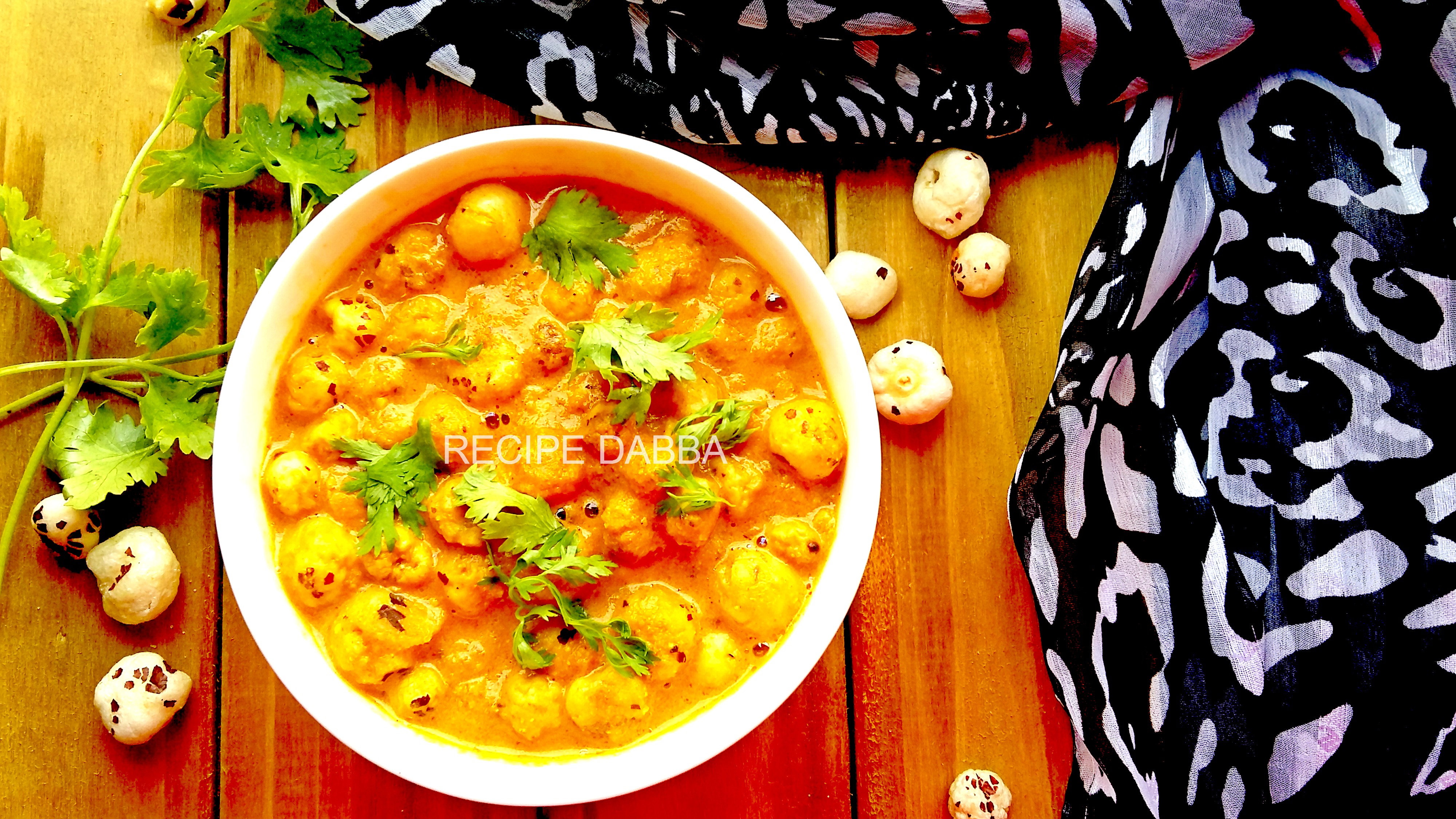 - Now add makhana in the gravy and then some milk and serve hot with some garnish of coriander leaves