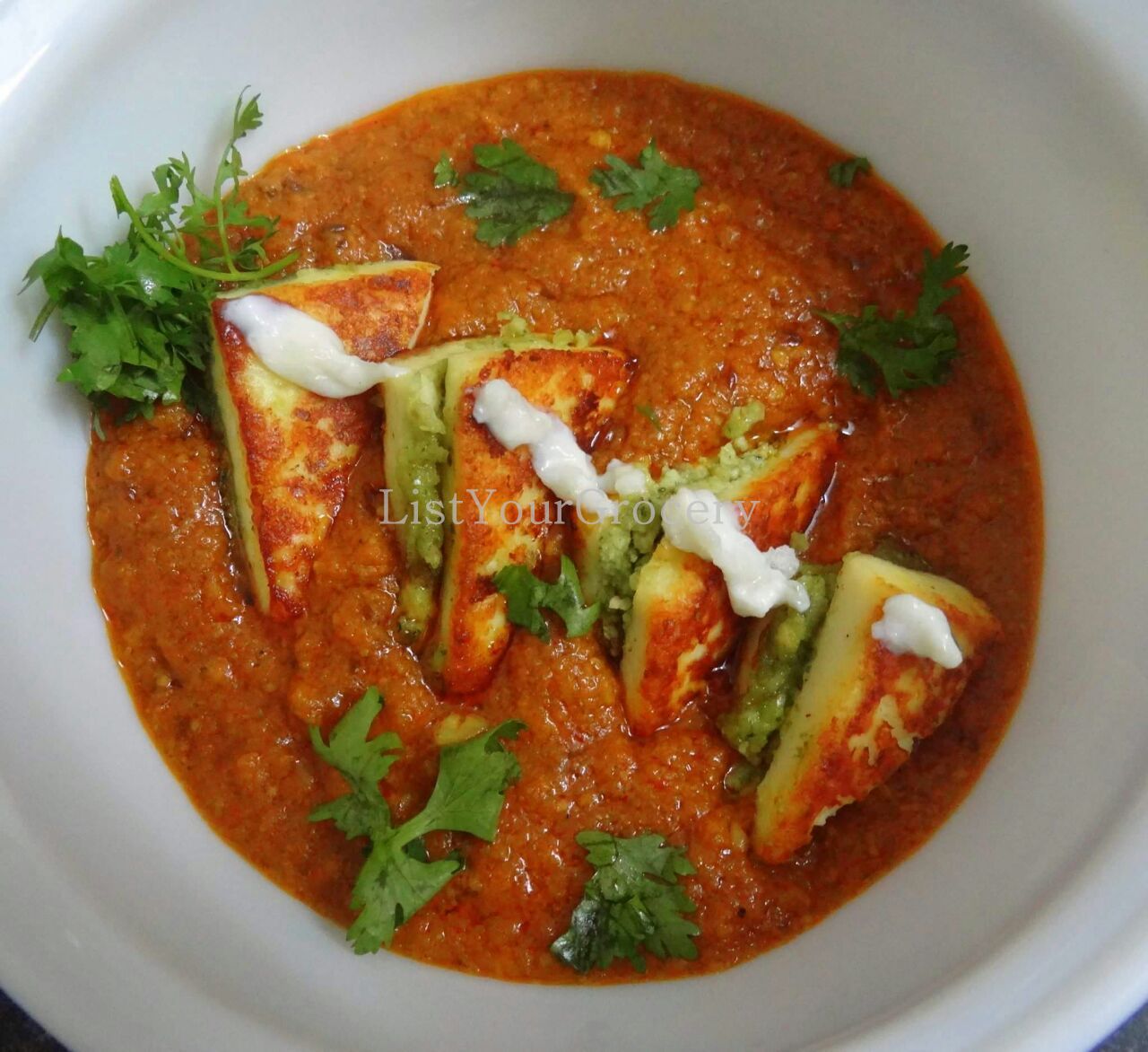 - Take a platter add the gravy and arrange the paneer triangle garnish with cheese and crispy onions fried.